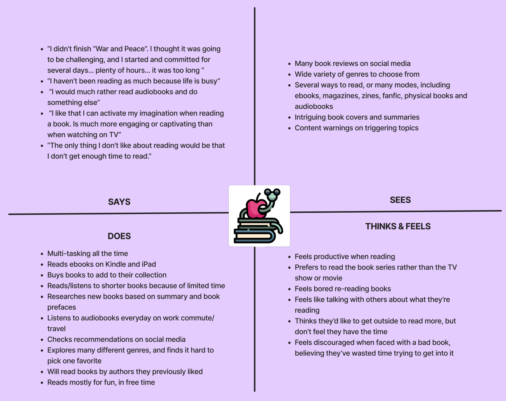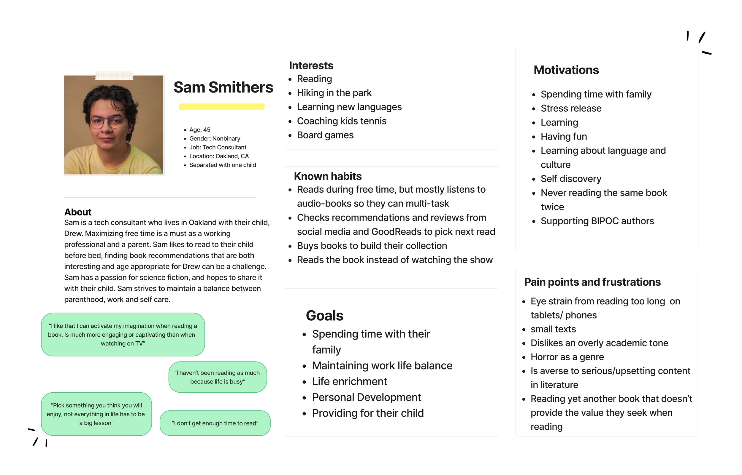 From our research, we developed Sam, a time-strapped, curious reader who often feels overwhelmed by the number of book options and limited free time.
