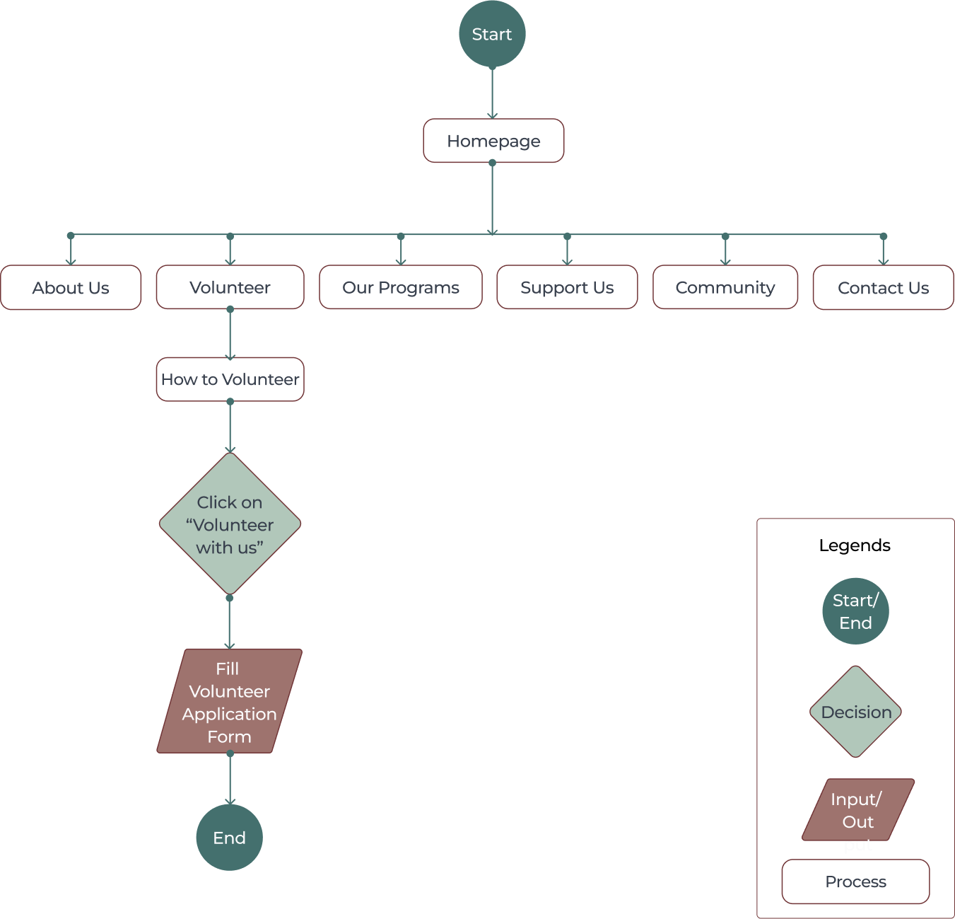 We redesigned the Sitemap and User Flow to make LITA’s website more intuitive and user-friendly. The Sitemap organizes content into clear sections like “About Us,” “Volunteer,” “Our Programs,” and “Support Us,” while the User Flow maps key tasks such as completing the volunteer application. These updates streamlined navigation, reduced confusion, and ensured smoother interactions that align with both user needs and LITA’s mission.