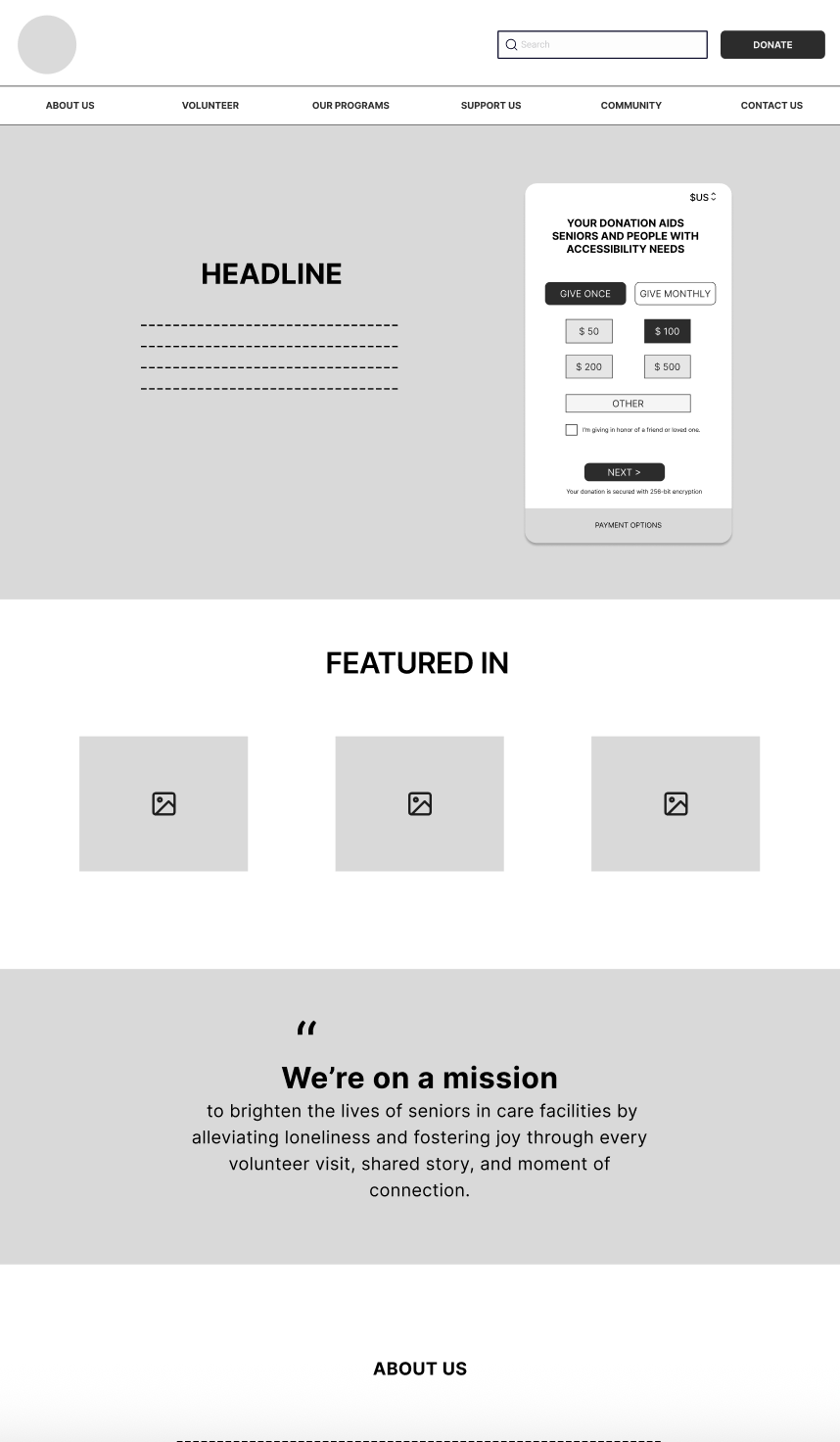 To support action, we introduced clear primary CTAs: 1. Volunteer 2. Donate We also improved section order so users could scan naturally from mission → services → action.